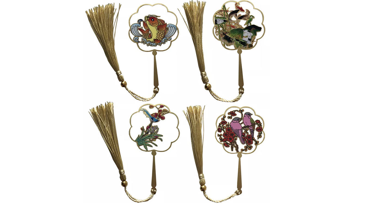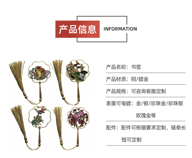 創意設計:此款金屬鏤空小書夾國潮風文創Logo書簽,以國潮文化花鳥、鯉魚等為元素,采用金屬鏤空工藝制作而成,外觀精美,做工精致,而且客戶可根據需求選擇流蘇尾LOGO標識,或者添加圖片文字進行個性化定制服務,讓每個書簽都獨具特色。