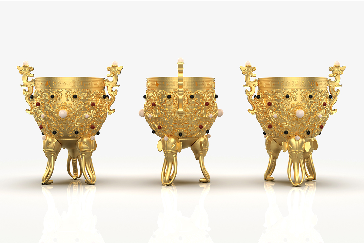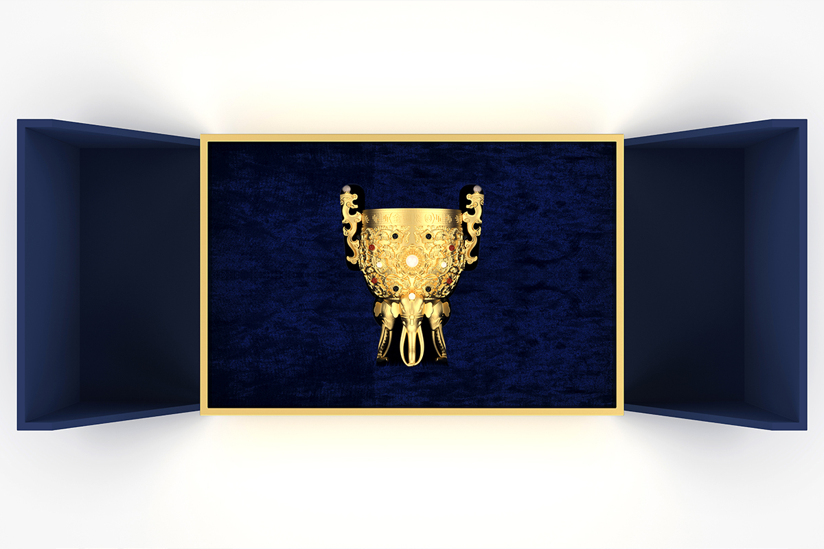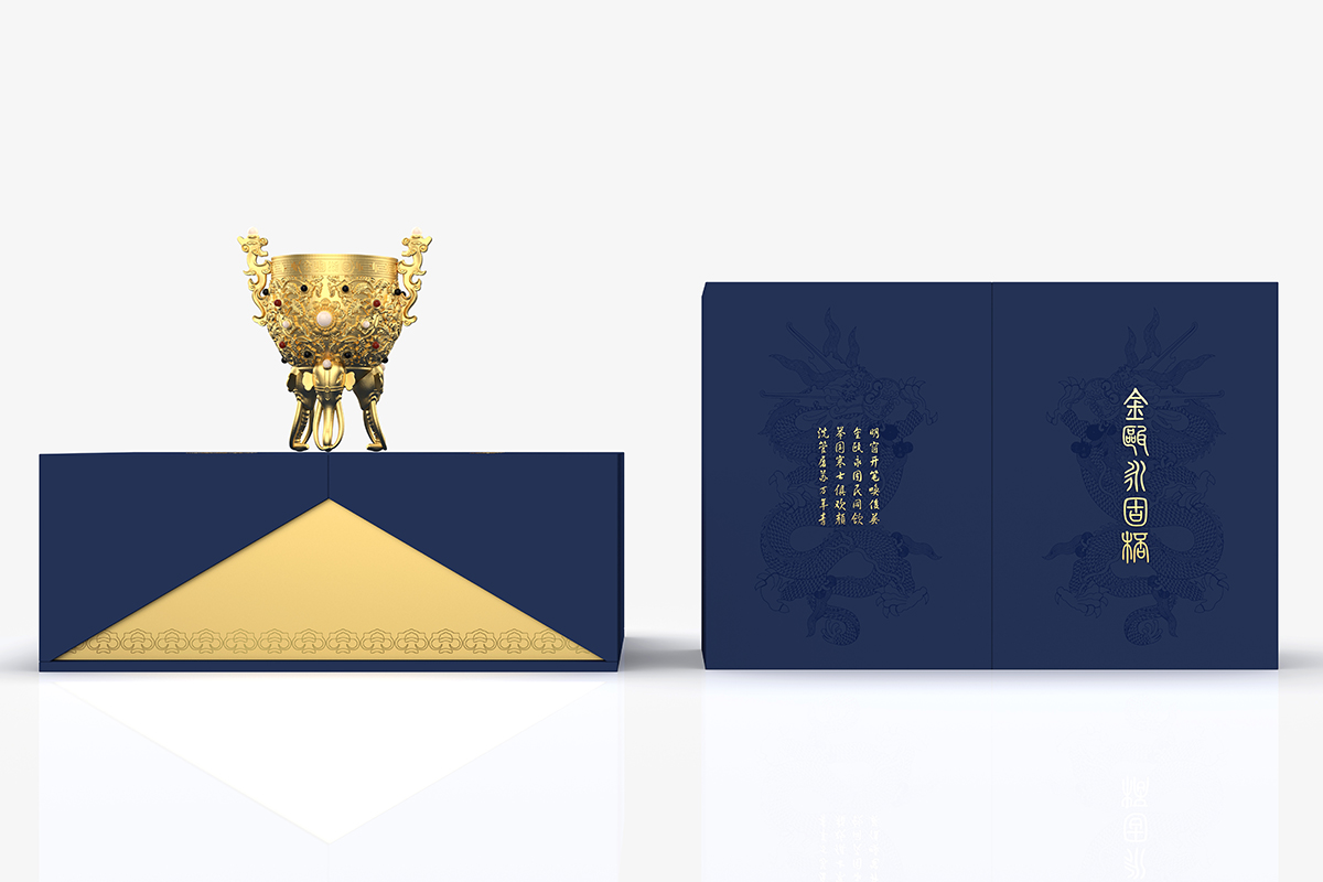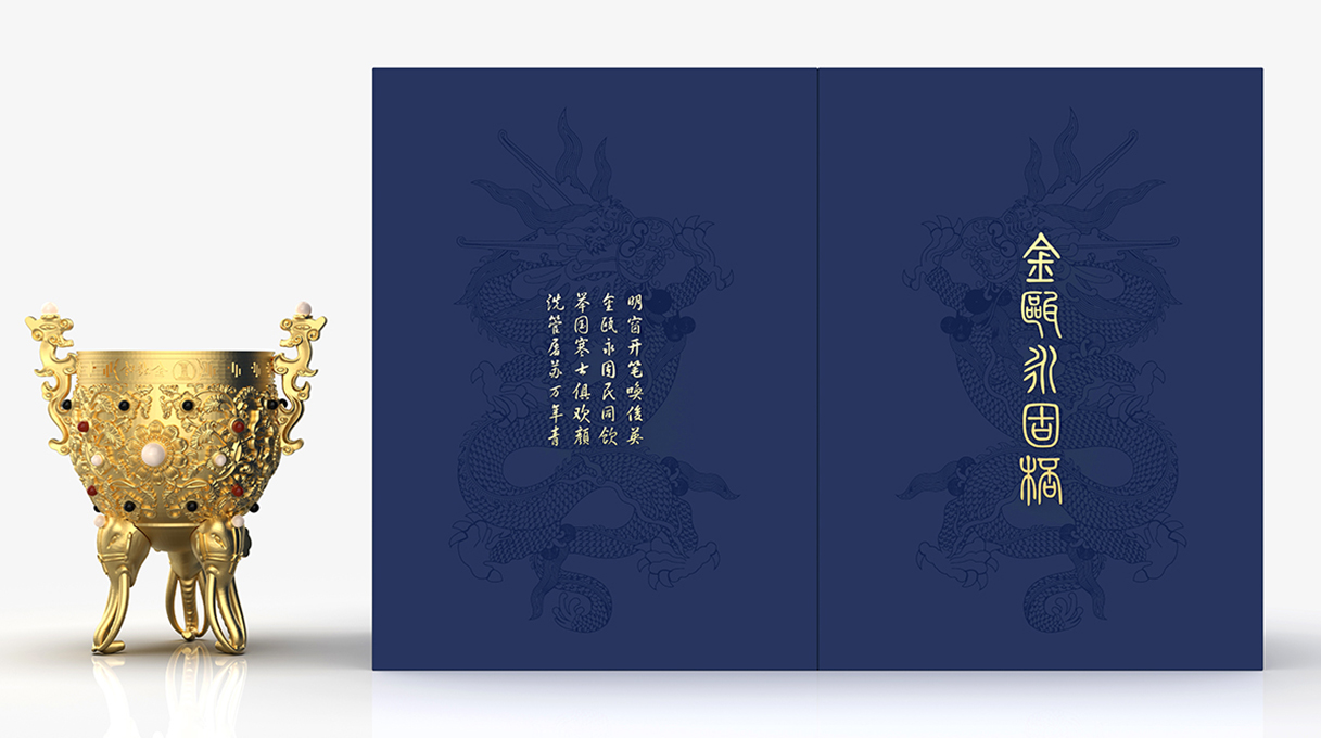 創(chuàng)意設(shè)計:此款酒具文創(chuàng)商務(wù)隨手禮是以故宮金甌永固杯為原型,設(shè)計制作的一款文創(chuàng)產(chǎn)品,整體造型以夔龍作為杯身兩邊的耳,龍頭上鑲嵌了珍珠,杯腿的設(shè)計用了三只象首,而三只大象的卷鼻分別作為杯子的立足支點。